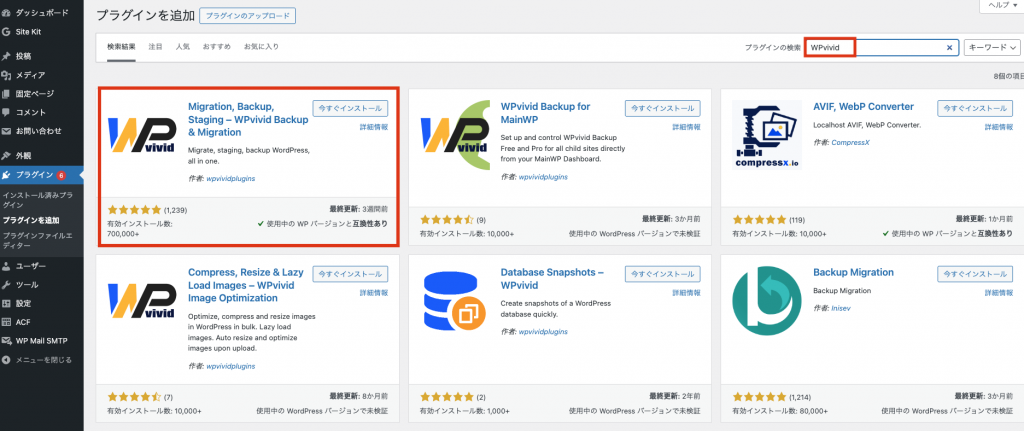 3.検索窓に「WPvivid」と入力