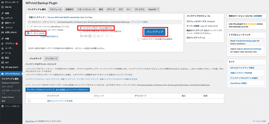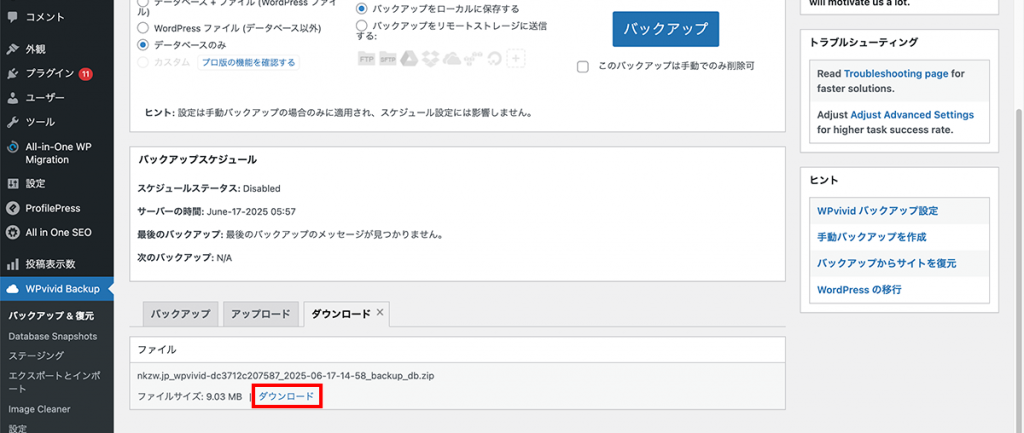 WPvividを使ったバックアップ取得の手順(データベースのみ)
